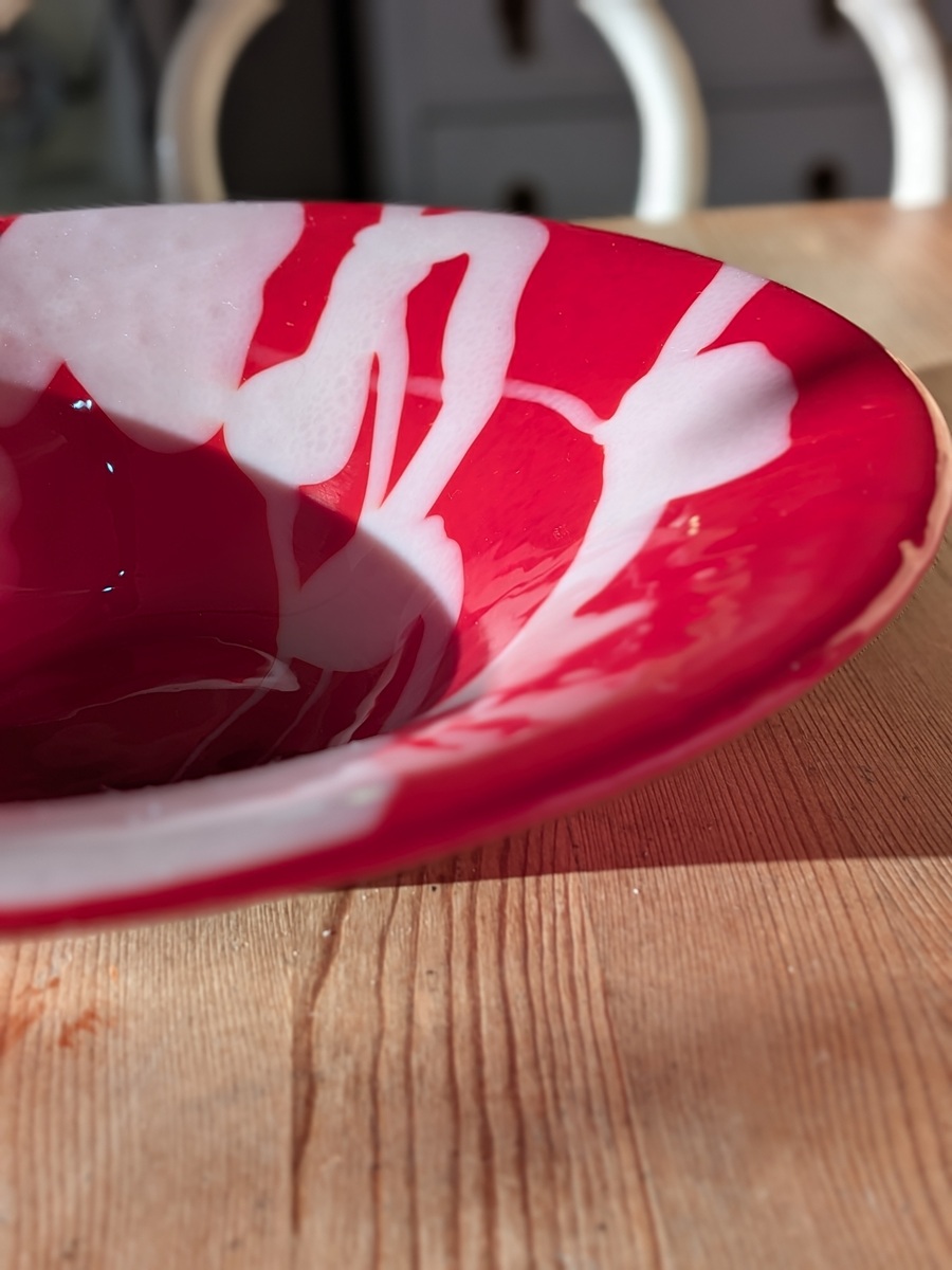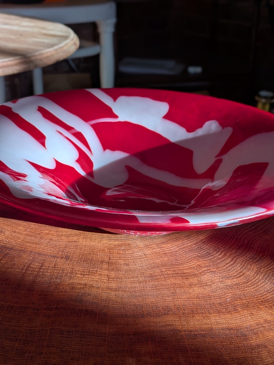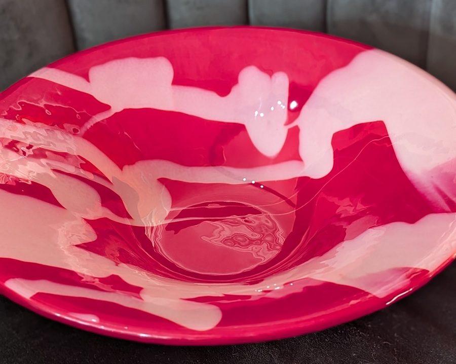 Handcrafted in fiery scarlet with flowing white, this one-of-a-kind glass bowl captivates the eye and tempts the touch. A bold centerpiece or unforgettable gift, it turns any space into a celebration of passion. 28.5cm x 7cm.