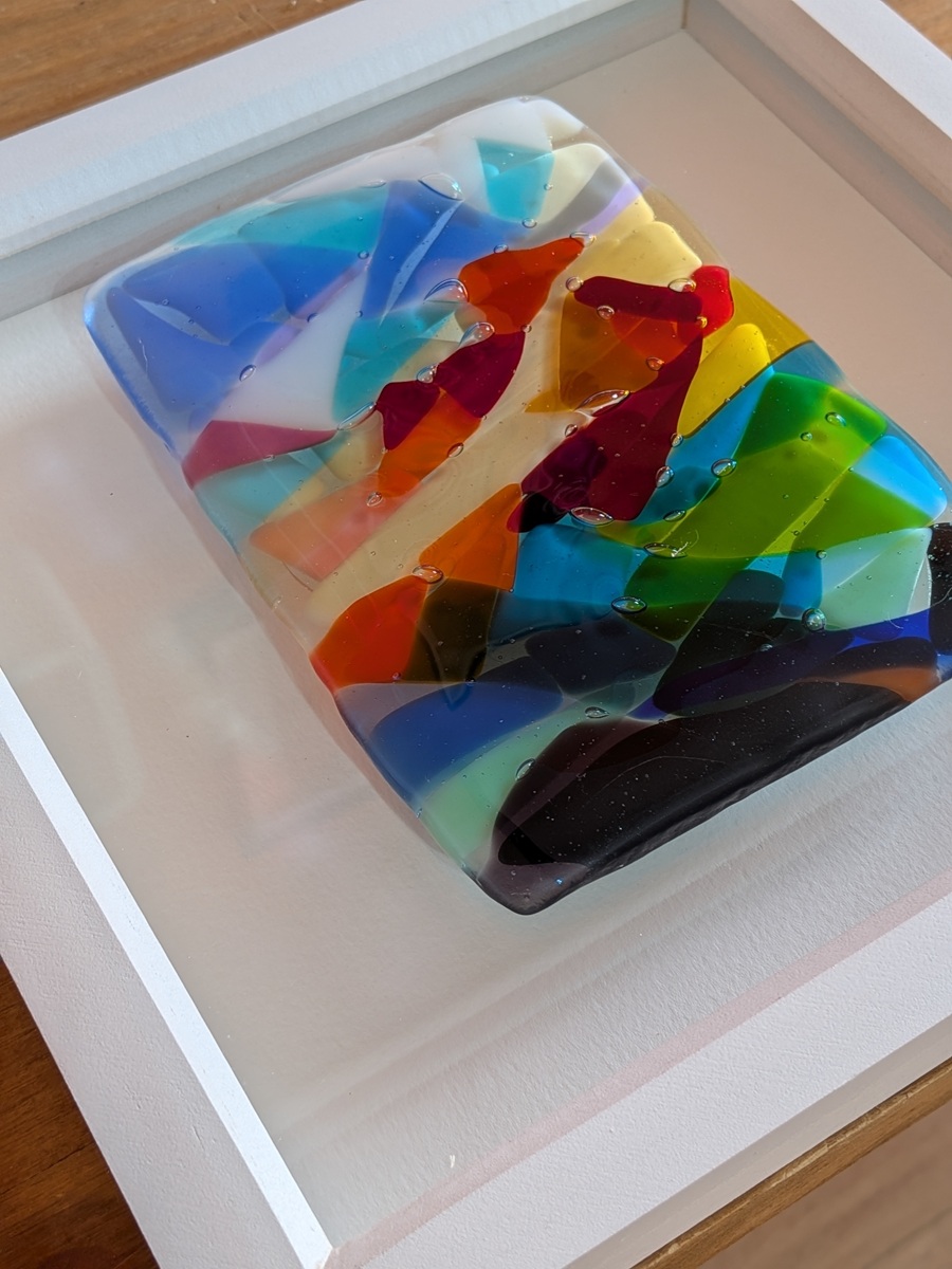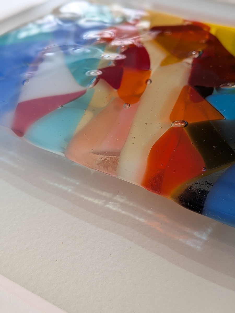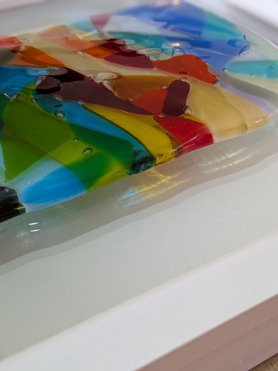 This isn’t just a flat image; it is a tactile exploration of light and color. I have built this piece using four layers of fused glass, which are then mounted on top of a clear glass base. This technique creates an incredible sense of depth and 3D texture, allowing the colors to change and glow as the light in your room shifts throughout the day.